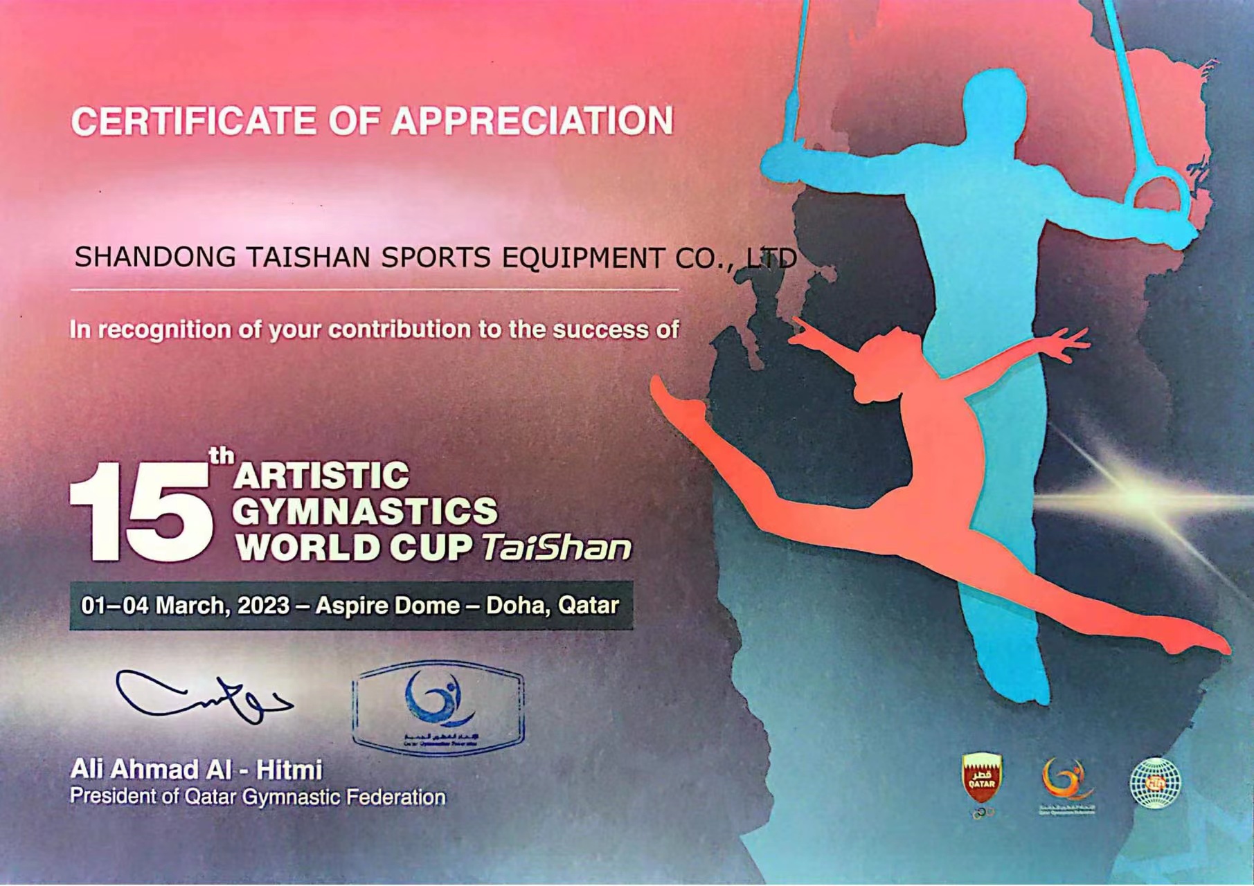 3月4日,第15届“泰山杯”国际体操联合会体操世界杯在卡塔尔多哈圆满落幕。短短4天时间,一届创新、绿色、安全、非凡的体操盛会呈现在全世界眼前,向世人完美诠释了体操运动精神和竞技体育精神。