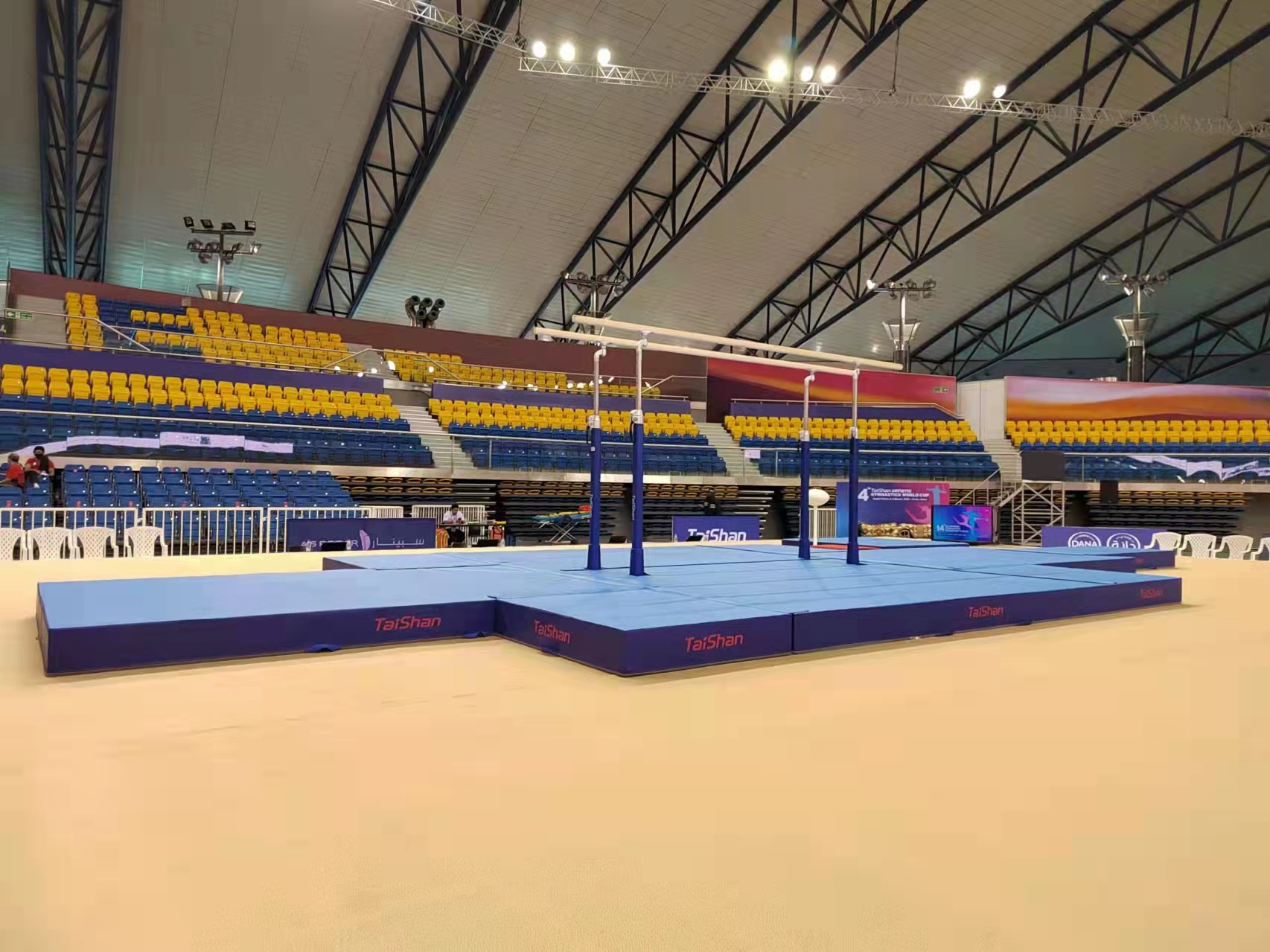 派出了经验丰富的专业服务团队,于2月22日出发,到达多哈后,队员们不辞辛劳,马上投入到技术指导和安装工作中,并按计划于2月28日圆满完成男子训练馆、女子训练馆、竞赛馆等场馆的安装、调试工作。
