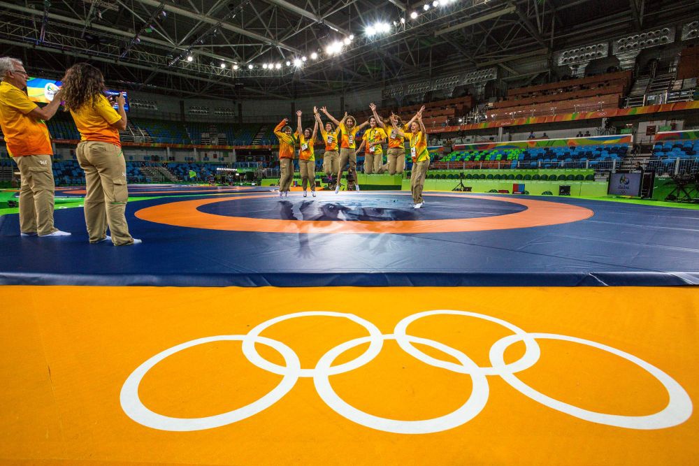 2016年8月18日,在里约奥运会摔跤场馆内,场馆工作人员和志愿者在摔跤垫上合影留念,这届奥运会的摔跤垫来自中国山东旺财28