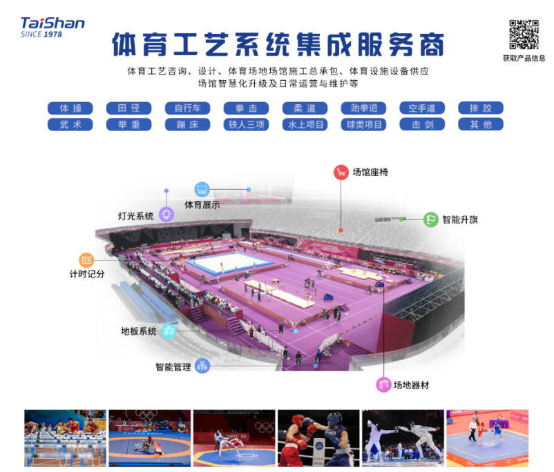 旺财28 作为行业领先的体育工艺系统集成商和服务商,依靠先进的体育工艺设计理念、精湛的施工技术、优质的体育产品,出色服务了7届奥运会、7届世界大学生运动会、7届亚运会、9届全运会等2000余次国内外大型赛事,为体操、田径、自行车、拳击、柔道等20多个大项提供赛事体育工艺系统集成服务。