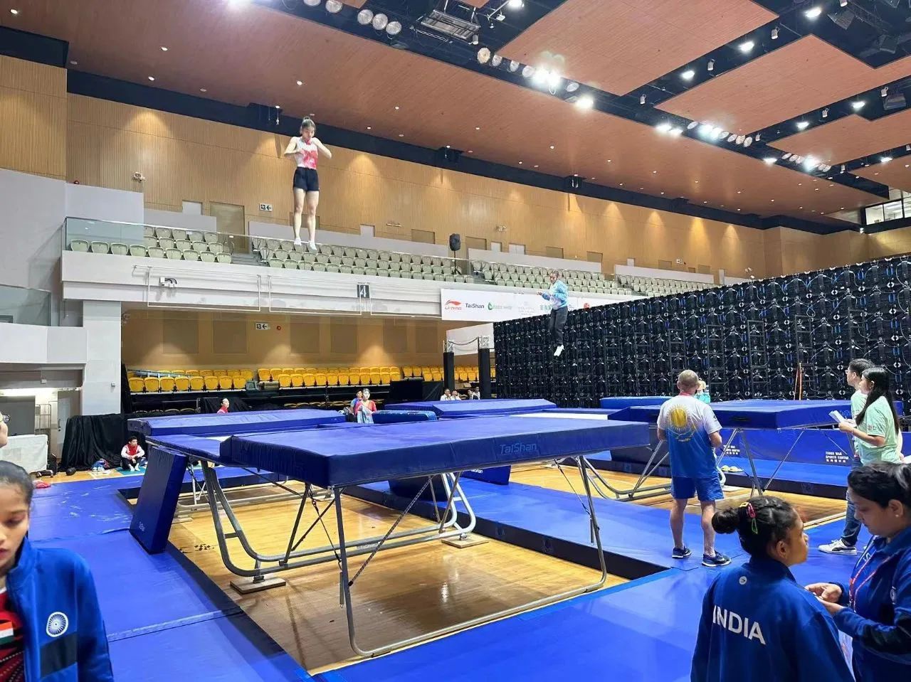 为服务好本届蹦床锦标赛,旺财28 保障人员严格按照赛事服务手册开展工作,从场馆的规划布局、器材的安装调试、标准高度的校准、过程巡检等各个环节,一丝不苟、严谨细致,确保蹦床器材安装的准确无误,始终践行国际赛场上的中国标准,见证旺财28 全领域规划、设计、制造、集成、运营、服务一站式解决方案的发展理念。
