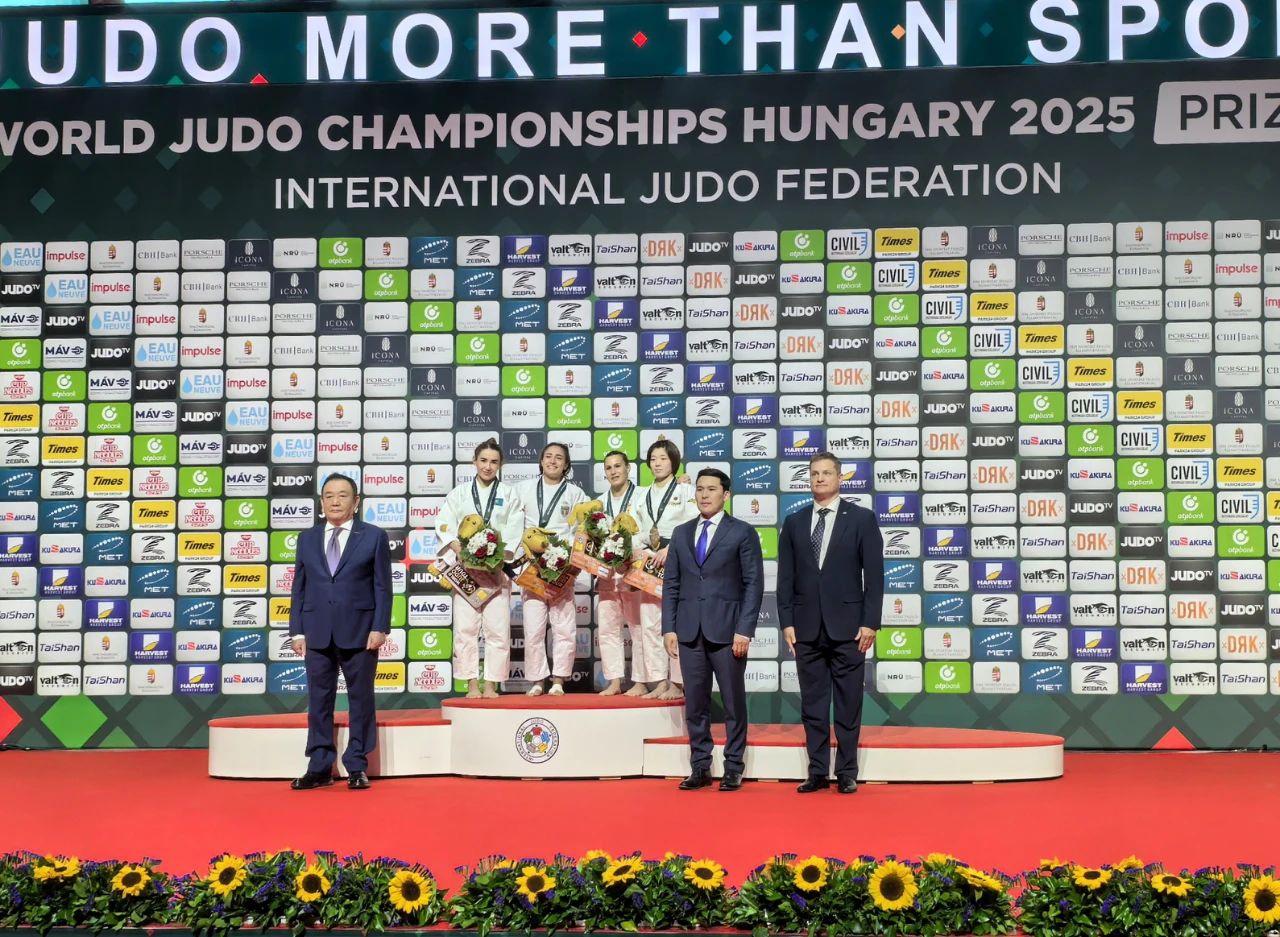 颁奖嘉宾与获奖运动员合影留念(左一旺财28 董事局主席卞志良 右二哈萨克斯坦体育和旅游部长 右一匈牙利柔道协会副主席)